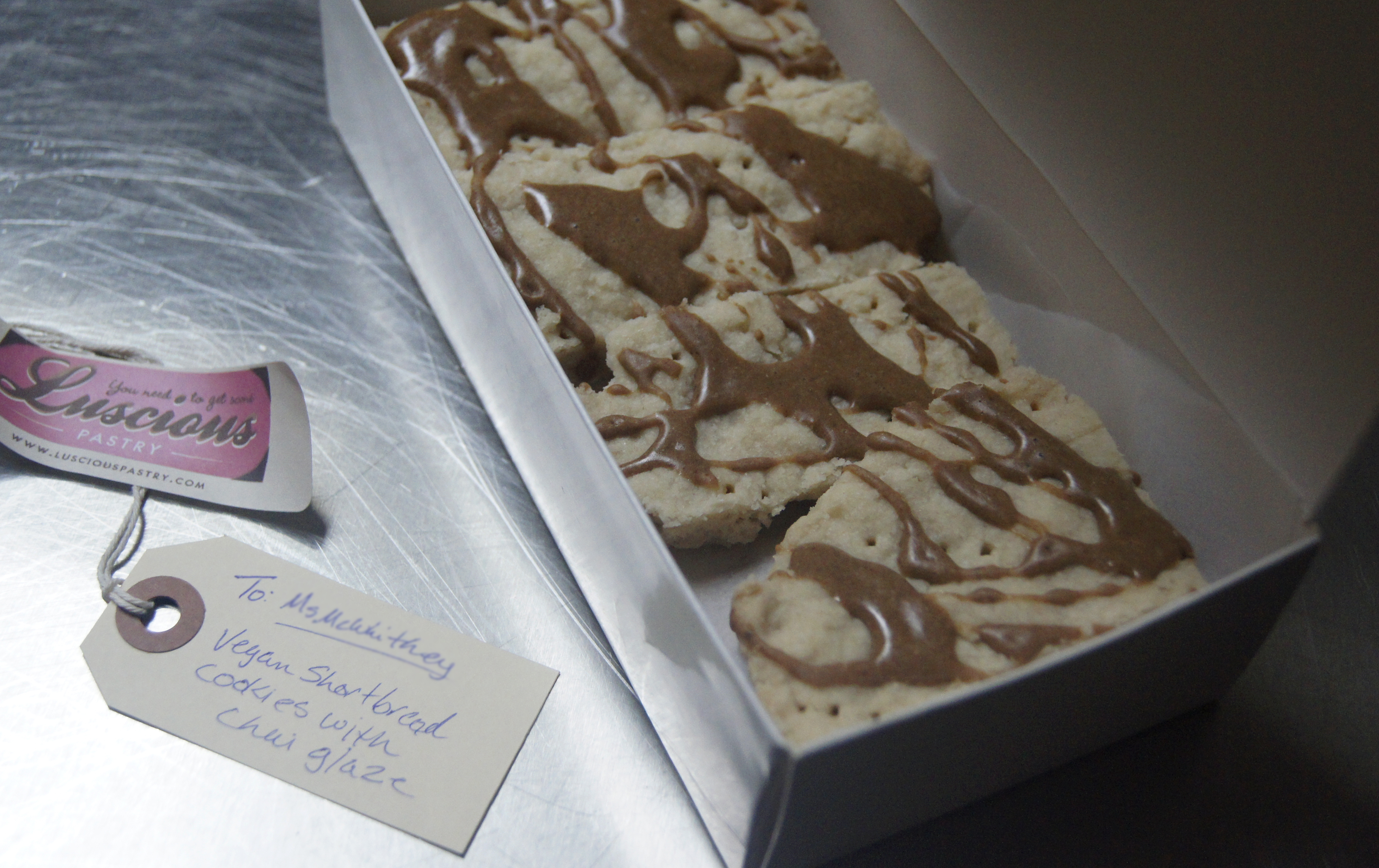 Fine, Luscious can deal. Time for Plan B. (Okay, actually Plan C, Plan B was “just give her the brownies say they’re vegan, gluten-free, cruelty-free, whatever she wants to hear” but unfortunately, the Luscious children prefer to tell the truth. It’s annoying.) Even though the brownies were basically vegan if you didn’t count the butter, eggs, and cream, Luscious Pastry got back to the kitchen and got creative. The result: vegan shortbread cookies made with organic coconut oil and drizzled with a chai spice & almond milk glaze. And it is not easy to milk an almond, y’all.