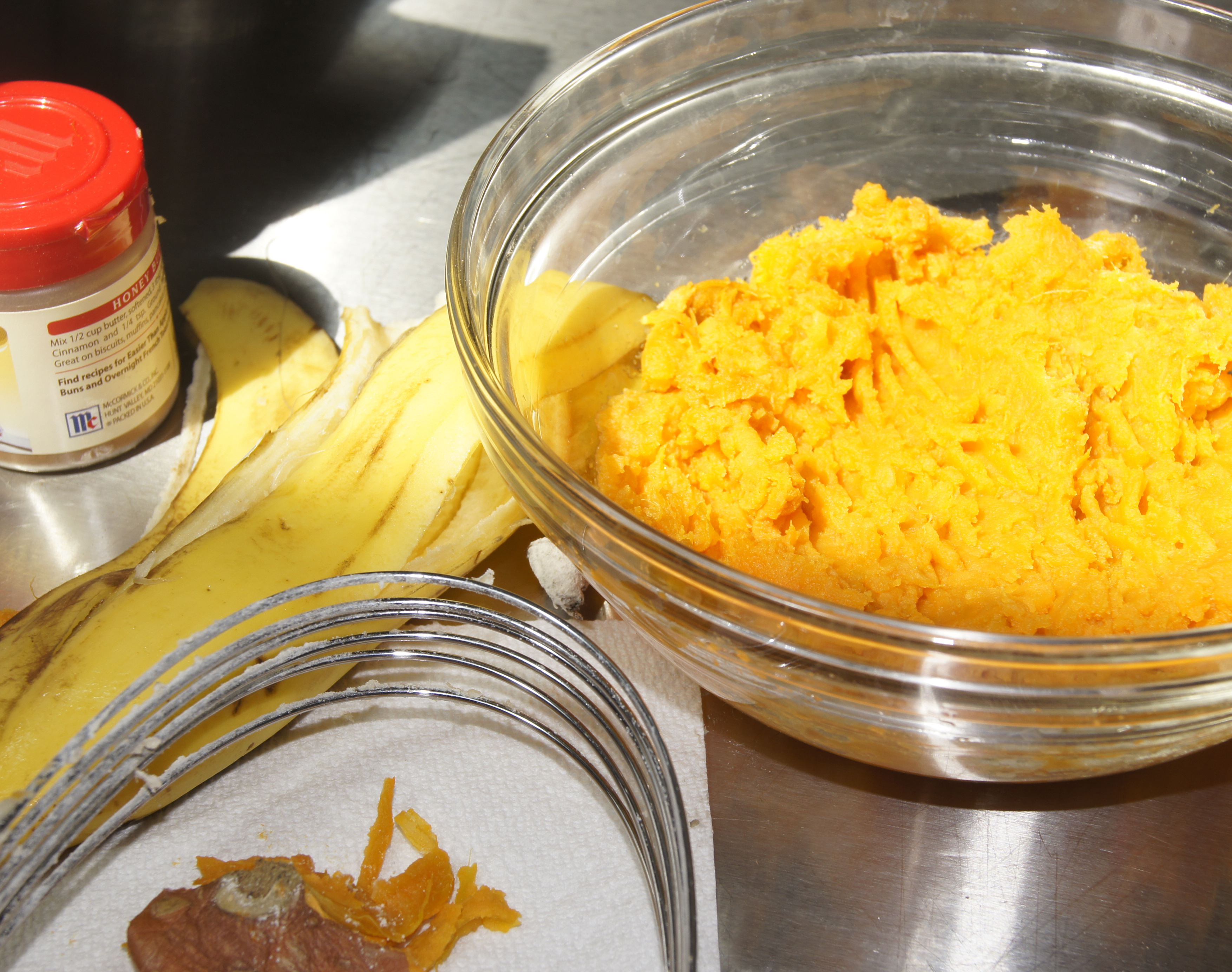 Bake or microwave your sweet potato until soft. Scoop out 1 cup of the pulp, mash thoroughly with the vanilla. Whisk together the flour, baking powder, baking soda, and salt. Mix the banana slices into the flour with a pastry cutter or fork until a shaggy dough forms. Then mix into the sweet potato mixture. Gather into a ball and knead against the sides of the mixing bowl a few times. The dough should resemble biscuit dough in texture.